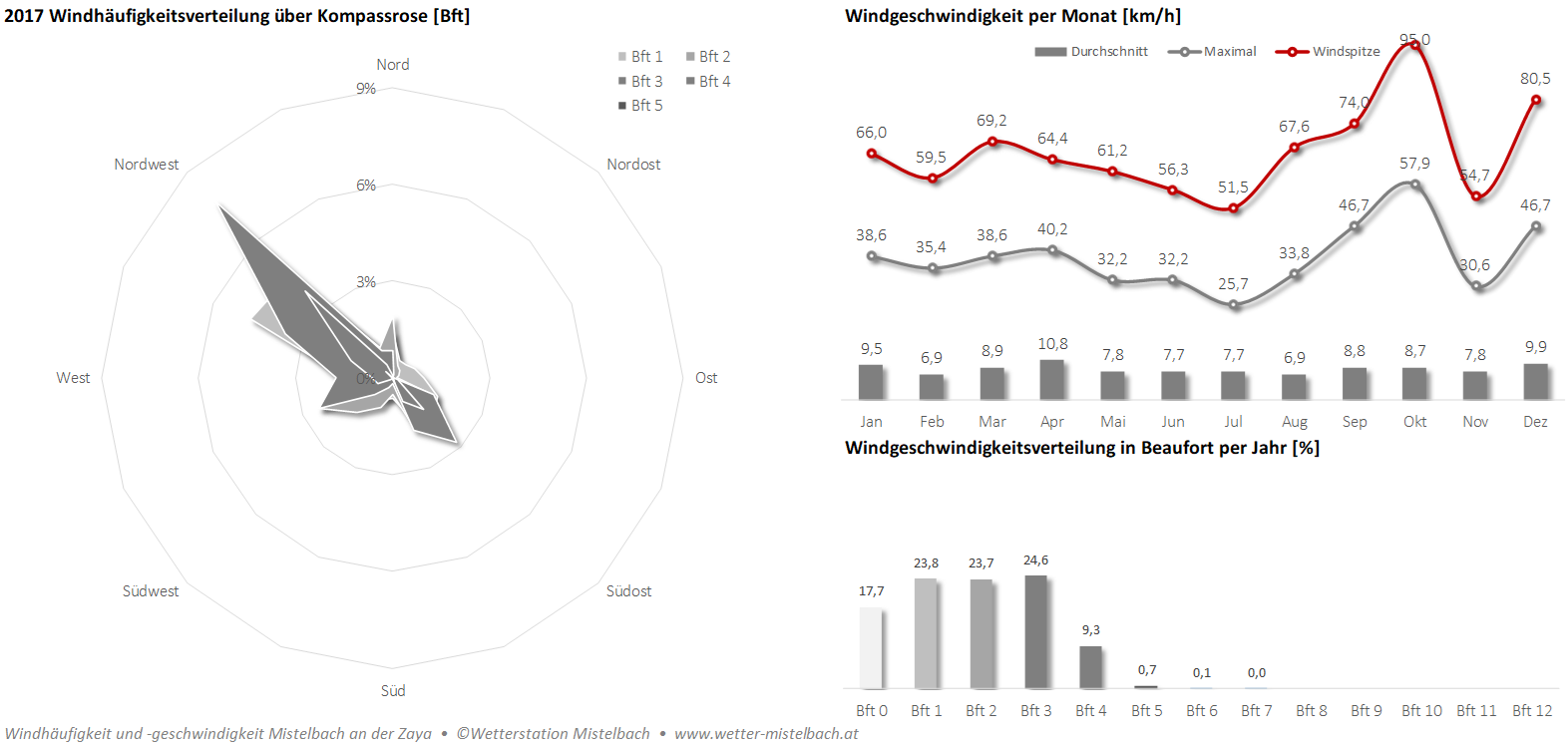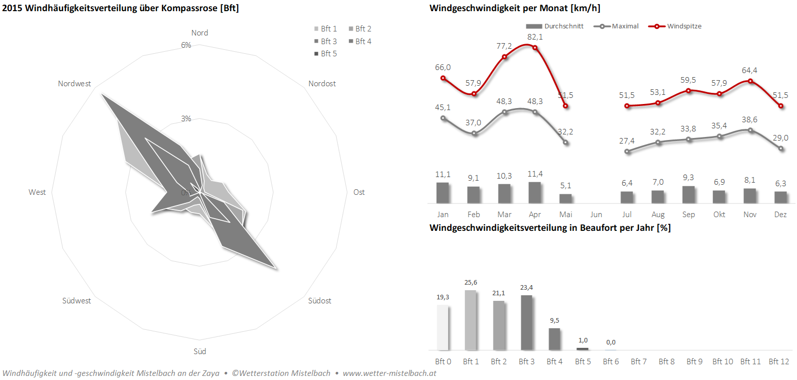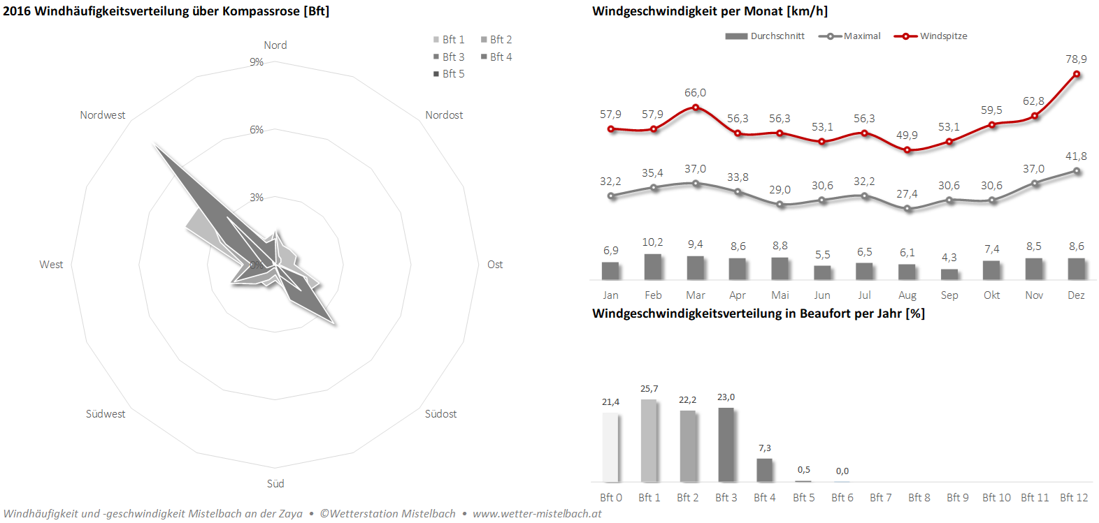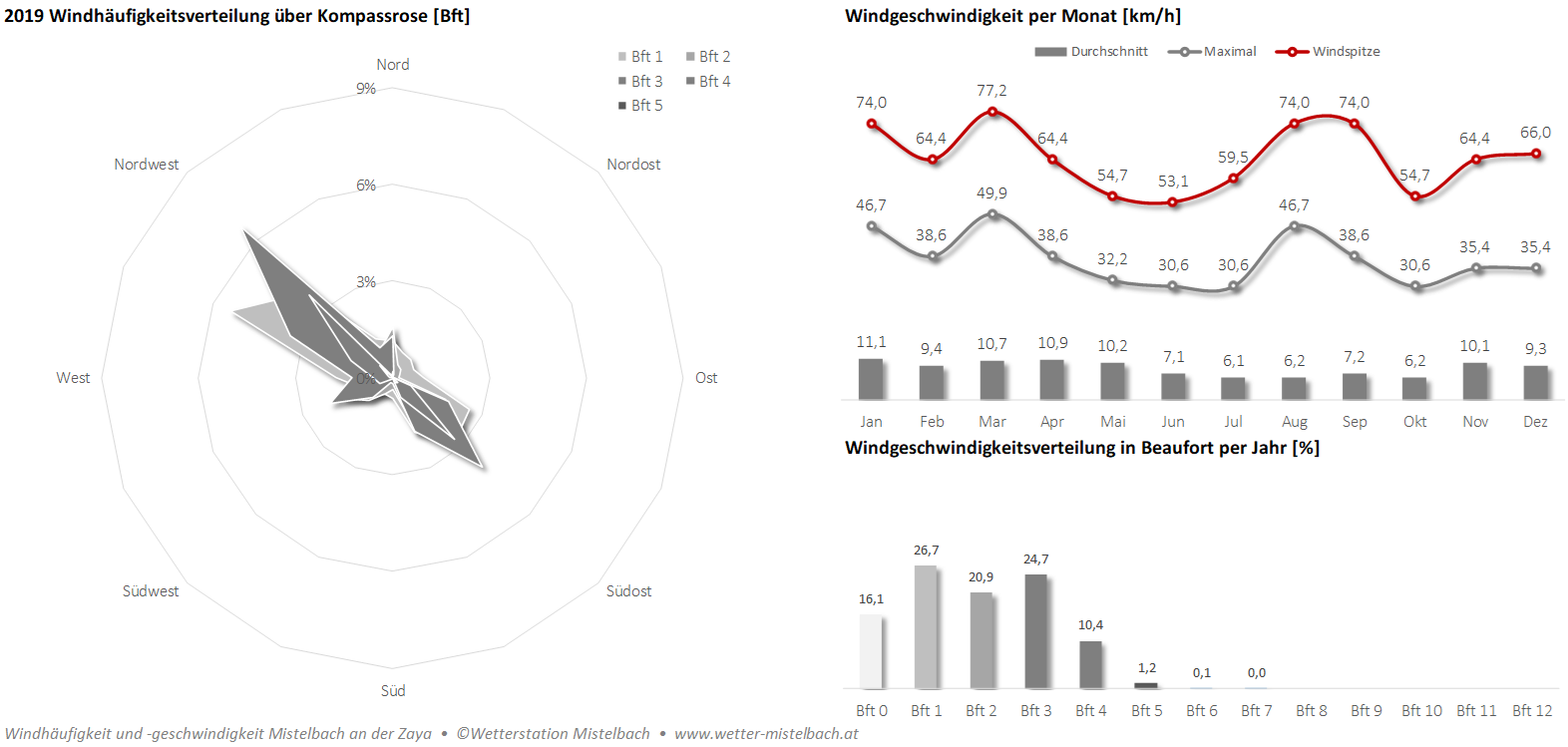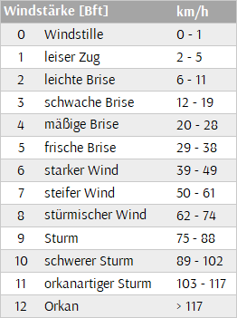 Werte nur von einem vollständig gemessenem Jahr aussagekräftig.Die Daten wurden zu drei Diagrammen zusammengefasst, die Informationen über Windrichtung, -geschwindigkeit und Windstärke darstellen. Bei der Windhäufigkeitsverteilung sind alle 10-Minutenmittelwerte gemäß der Beaufortskala klassifiziert und ihre Häufikgeit den Himmelsrichtungen zugeordnet. Dabei zeigt sich sehr schön die für unsere Breitengrade übliche Nordwest/Südost Hauptwindrichtung. Die Beaufortskala ist das weitestverbreitete System zur Klassifikation von Windstärke anhand der Windgeschwindigkeit. In der Tabelle rechts oben sind die Windgeschwindigkeitsbereiche den Beaufortklassen zur Erklärung zugeordnet. Im Beobachtungszeitraum kam die Windkraft im Mittelwert nie über Beaufort 6 hinaus. Zwecks der Übersichtlichkeit sind in der Kompassrose nur die Windstärken 1 bis 5 abgebildet, die ca. 90% aller Messwerte beinhalten. Im Diagramm Windkraftverteilung in Beaufort sind die Windhäufigkeiten des Jahres in den Beaufortklassen dargestellt, wobei die Klasse 0 für Windstille steht. Die Windgeschwindkeiten per Monat sind in den Diagrammen im Monatsmittel, das auf alle 10-Minutenmittelwerte aufsetzt, dargestellt. Zusätzlich sind die maximalen Mittelwerte sowie die tatsächlich gemessenen Windspitzen (Böen) in Linienform dargestellt. Für Fragen und Anregungen stehe ich sehr gerne zur Verfügung. Windrichtung und -stärke für 2025 ![]() Windrichtung und -stärke für 2024 ![]() Windrichtung und -stärke für 2021 ![]() Windrichtung und -stärke für 2020 ![]() Windrichtung und -stärke für 2019 ![]() Windrichtung und -stärke für 2018 ![]() Windrichtung und -stärke für 2017 ![]() Windrichtung und -stärke für 2016 ![]() Windrichtung und -stärke für 2015 ![]() Windrichtung und -stärke für 2014 ![]() |