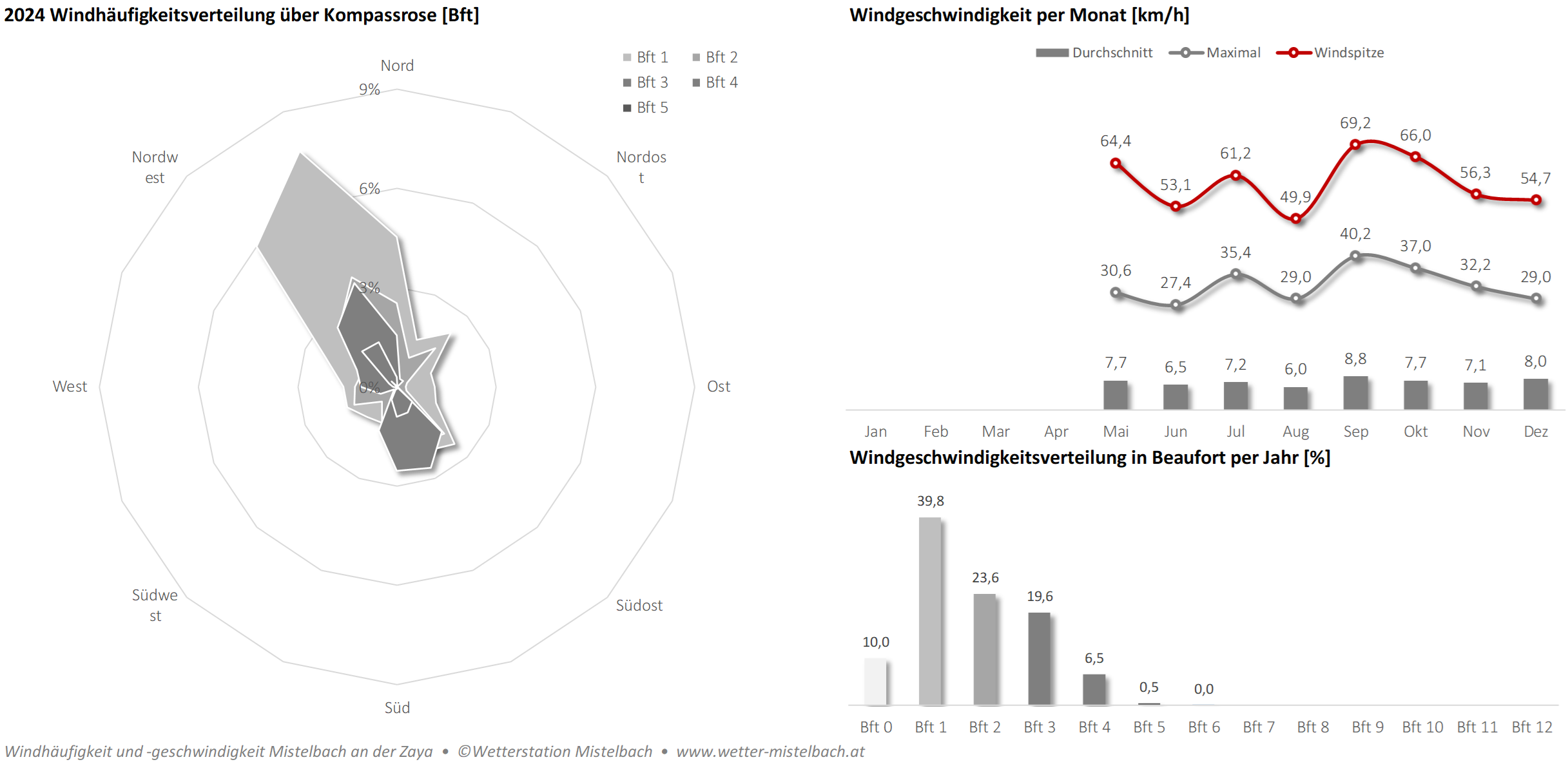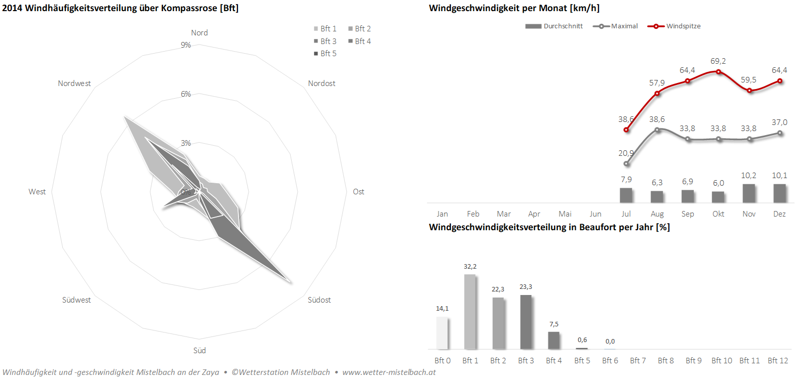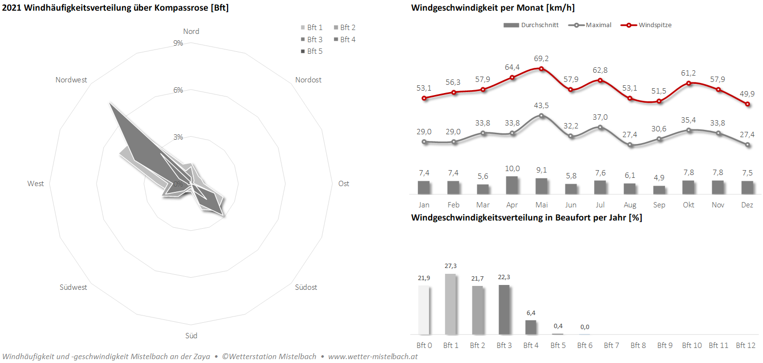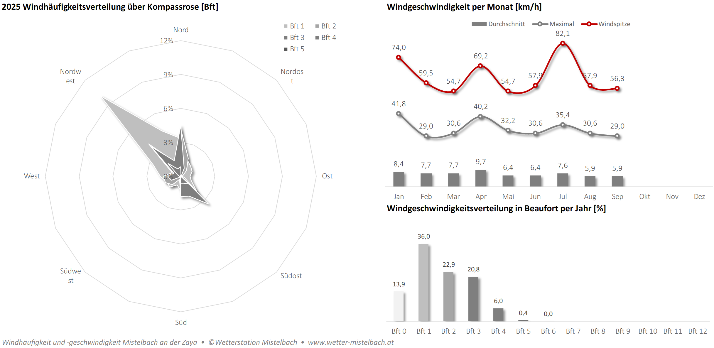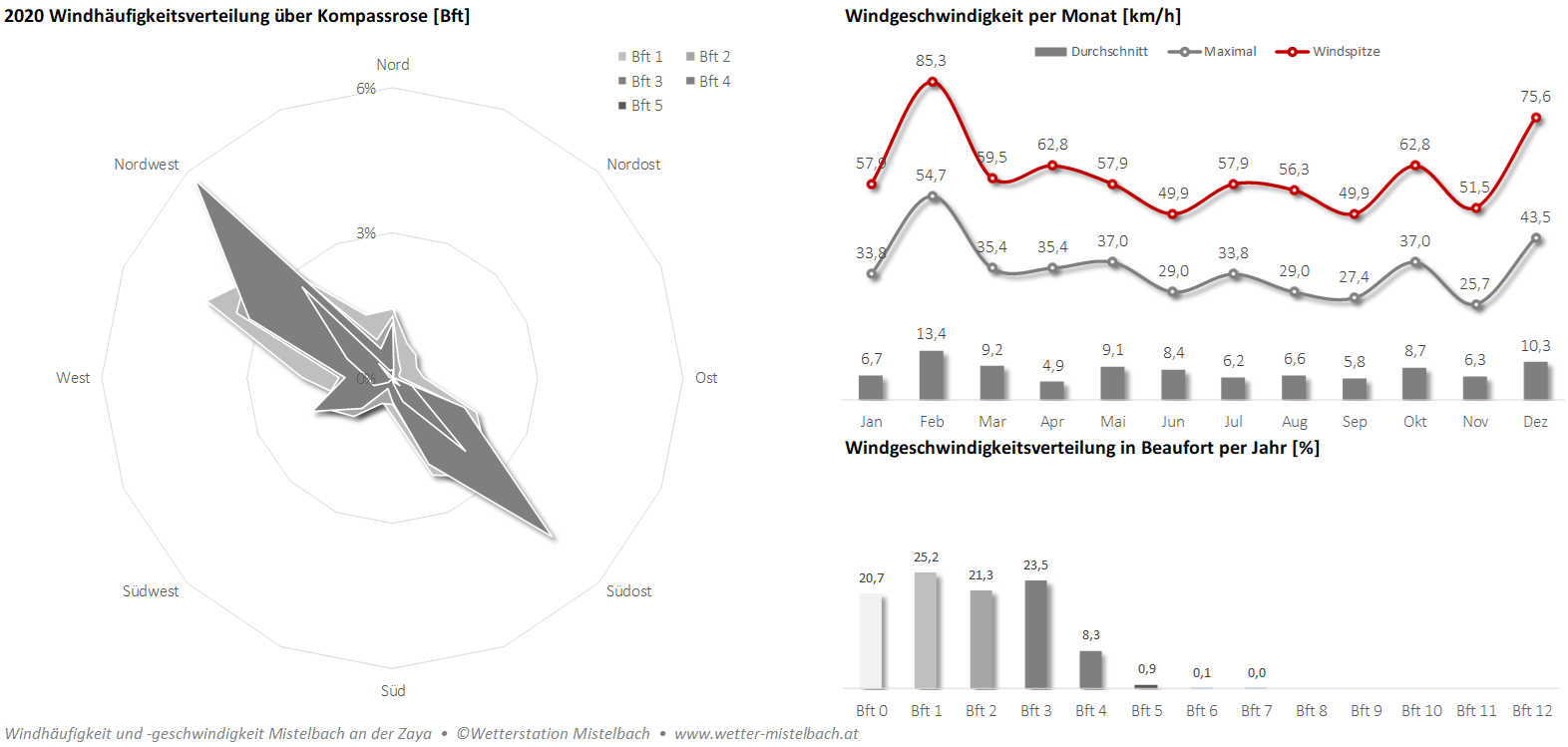 Werte nur von einem vollständig gemessenem Jahr aussagekräftig.Die Daten wurden zu drei Diagrammen zusammengefasst, die Informationen über Windrichtung, -geschwindigkeit und Windstärke darstellen. Bei der Windhäufigkeitsverteilung sind alle 10-Minutenmittelwerte gemäß der Beaufortskala klassifiziert und ihre Häufikgeit den Himmelsrichtungen zugeordnet. Dabei zeigt sich sehr schön die für unsere Breitengrade übliche Nordwest/Südost Hauptwindrichtung. Die Beaufortskala ist das weitestverbreitete System zur Klassifikation von Windstärke anhand der Windgeschwindigkeit. In der Tabelle rechts oben sind die Windgeschwindigkeitsbereiche den Beaufortklassen zur Erklärung zugeordnet. Im Beobachtungszeitraum kam die Windkraft im Mittelwert nie über Beaufort 6 hinaus. Zwecks der Übersichtlichkeit sind in der Kompassrose nur die Windstärken 1 bis 5 abgebildet, die ca. 90% aller Messwerte beinhalten. Im Diagramm Windkraftverteilung in Beaufort sind die Windhäufigkeiten des Jahres in den Beaufortklassen dargestellt, wobei die Klasse 0 für Windstille steht. Die Windgeschwindkeiten per Monat sind in den Diagrammen im Monatsmittel, das auf alle 10-Minutenmittelwerte aufsetzt, dargestellt. Zusätzlich sind die maximalen Mittelwerte sowie die tatsächlich gemessenen Windspitzen (Böen) in Linienform dargestellt. Für Fragen und Anregungen stehe ich sehr gerne zur Verfügung. Windrichtung und -stärke für 2025 ![]() Windrichtung und -stärke für 2024 ![]() Windrichtung und -stärke für 2021 ![]() Windrichtung und -stärke für 2020 ![]() Windrichtung und -stärke für 2019 ![]() Windrichtung und -stärke für 2018 ![]() Windrichtung und -stärke für 2017 ![]() Windrichtung und -stärke für 2016 ![]() Windrichtung und -stärke für 2015 ![]() Windrichtung und -stärke für 2014 ![]() |