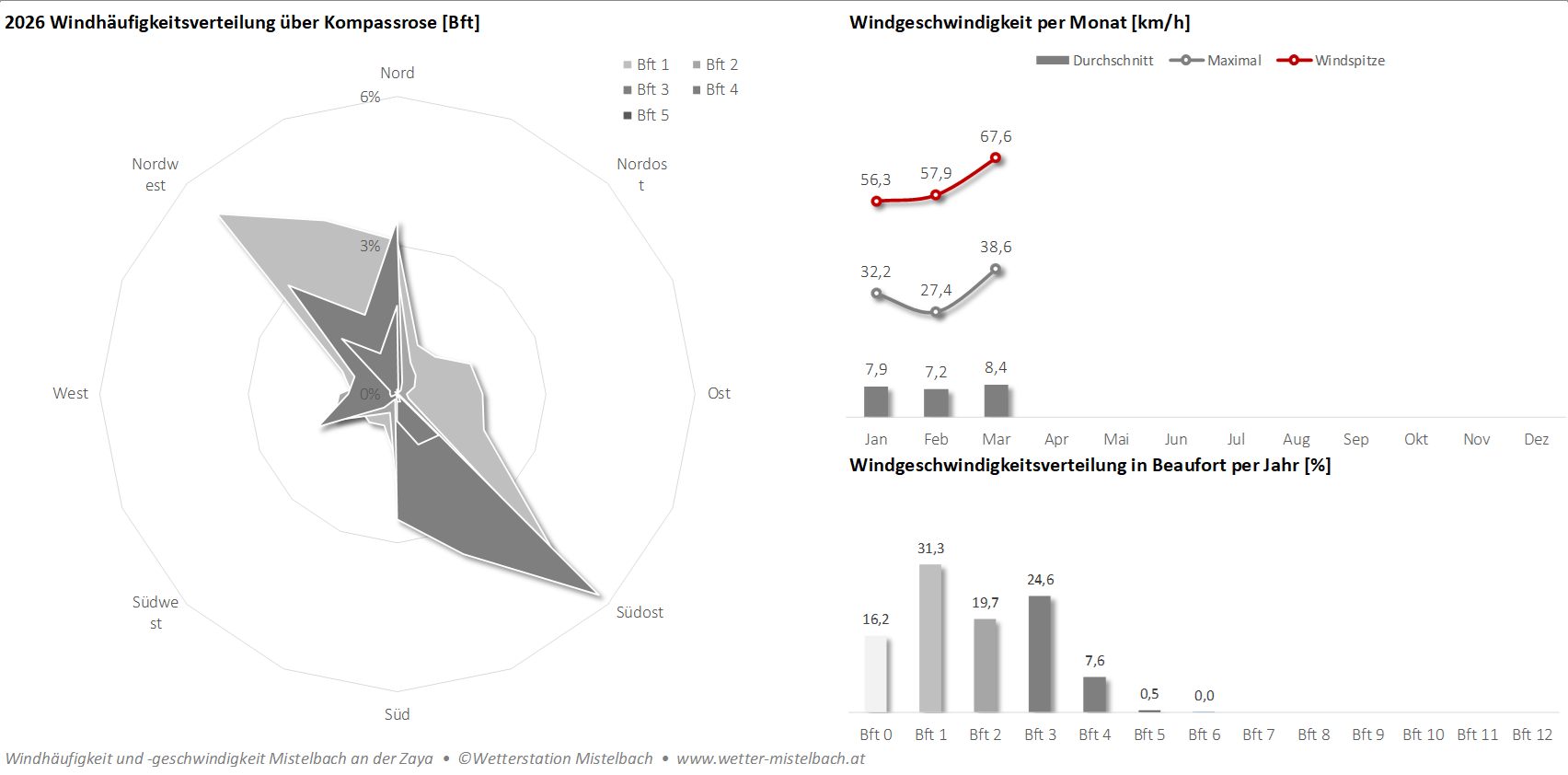 Werte nur von einem vollständig gemessenem Jahr aussagekräftig.Die Daten wurden zu drei Diagrammen zusammengefasst, die Informationen über Windrichtung, -geschwindigkeit und Windstärke darstellen. Bei der Windhäufigkeitsverteilung sind alle 10-Minutenmittelwerte gemäß der Beaufortskala klassifiziert und ihre Häufikgeit den Himmelsrichtungen zugeordnet. Dabei zeigt sich sehr schön die für unsere Breitengrade übliche Nordwest/Südost Hauptwindrichtung. Die Beaufortskala ist das weitestverbreitete System zur Klassifikation von Windstärke anhand der Windgeschwindigkeit. In der Tabelle rechts oben sind die Windgeschwindigkeitsbereiche den Beaufortklassen zur Erklärung zugeordnet. Im Beobachtungszeitraum kam die Windkraft im Mittelwert nie über Beaufort 6 hinaus. Zwecks der Übersichtlichkeit sind in der Kompassrose nur die Windstärken 1 bis 5 abgebildet, die ca. 90% aller Messwerte beinhalten. Im Diagramm Windkraftverteilung in Beaufort sind die Windhäufigkeiten des Jahres in den Beaufortklassen dargestellt, wobei die Klasse 0 für Windstille steht. Die Windgeschwindkeiten per Monat sind in den Diagrammen im Monatsmittel, das auf alle 10-Minutenmittelwerte aufsetzt, dargestellt. Zusätzlich sind die maximalen Mittelwerte sowie die tatsächlich gemessenen Windspitzen (Böen) in Linienform dargestellt. Für Fragen und Anregungen stehe ich sehr gerne zur Verfügung. Windrichtung und -stärke für 2026 ![]() Windrichtung und -stärke für 2025 ![]() Windrichtung und -stärke für 2024 ![]() Windrichtung und -stärke für 2021 ![]() Windrichtung und -stärke für 2020 ![]() Windrichtung und -stärke für 2019 ![]() Windrichtung und -stärke für 2018 ![]() Windrichtung und -stärke für 2017 ![]() Windrichtung und -stärke für 2016 ![]() Windrichtung und -stärke für 2015 ![]() Windrichtung und -stärke für 2014 ![]() |